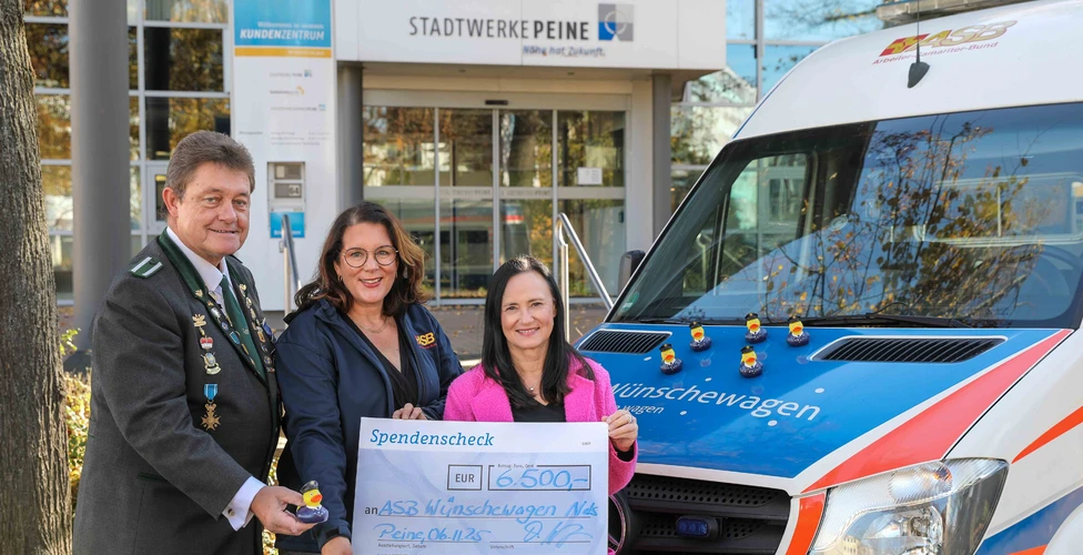 Dass auch in Zukunft Herzenswünsche von schwer Erkrankten aus der Region in Erfüllung gehen können, dafür sorgt nun eine Spende der Stadtwerke Peine in Höhe von 6.500 Euro. Die nämlich hat den gesamten Verkaufserlös der Kult-Ente „Fritz Freischießen 2025“ dem ASB-Ehrenamtsprojekt zur Verfügung gestellt. Die Spendenaktion stand – wie in den Vorjahren – ganz im Zeichen des sozialen Miteinanders. Möglich wurde sie durch das Engagement vieler Bürgerinnen und Bürger, die mit dem Kauf von Fritz gezeigt haben: Wenn eine Stadt zusammenhält, können Herzenswünsche wahr werden: „Fritz bringt Menschen zusammen – und das nicht nur beim Freischießen“, sagt Stadtwerke-Geschäftsführer Ralf Schürmann. „Wir freuen uns, mit dem diesjährigen Verkauf unseres Fritz Freischießen Vater Jahn 2025 dem Wünschewagen neue Fahrt zu geben – für Herzenswünsche, die unvergessen bleiben. Ein großes Dankeschön geht erneut an Bürgerschaffer Thomas Weitling, der den Verkauf dieses Jahr wieder persönlich und tatkräftig unterstützt hat.“